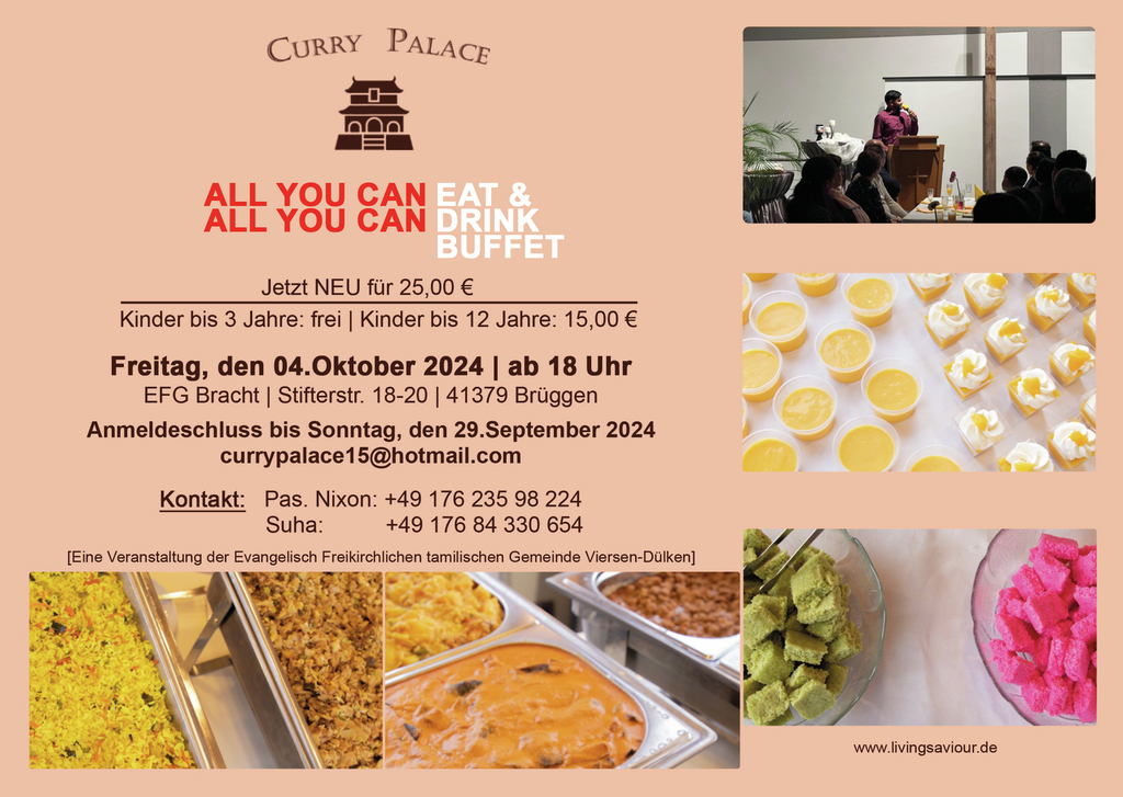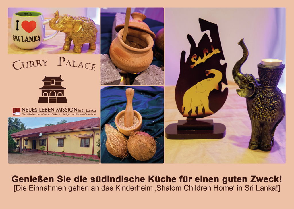 Curry Palace' ist eine Wohltätigkeitsveranstaltung, bei der Sie die Vielfalt der tamilischen und indischen Küche genießen können. Die Einnahmen dieser Wohltätig-keitsveranstaltung gehen an das Kinderheim Shalom Children Home in Puttalam - der christlichen Neues Leben Mission in Sri Lanka.